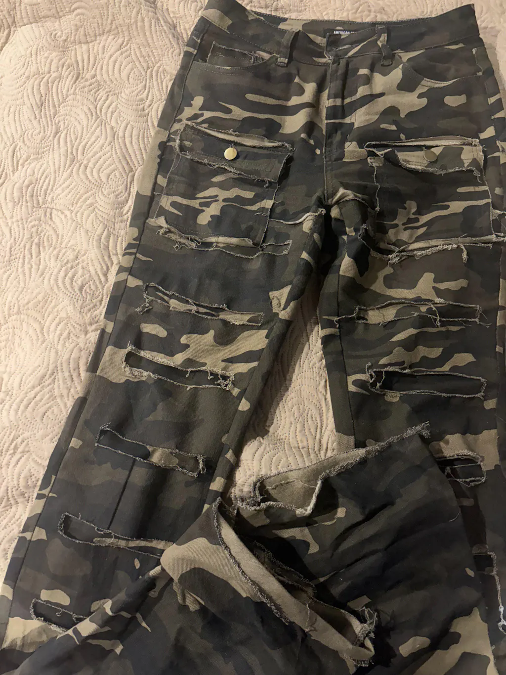 Pair these deconstructed camo stacked skinny jeans with a black bodysuit and leather jacket for a sleek night-out look, or wear them with a relaxed knit and clean sneakers for a more casual street-style outfit. Their statement finish works best when balanced with simple tops and accessories.